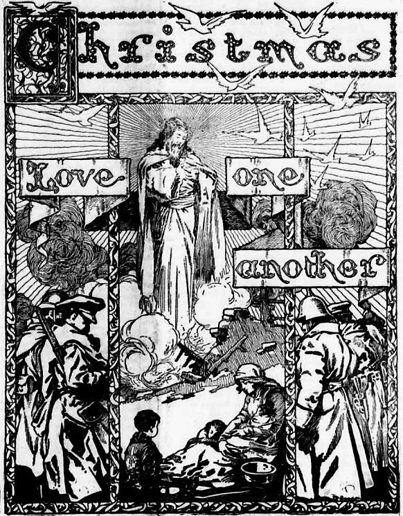Caption: Christmas at a time of war; artwork showing Allied and German troops pausing to gaze at a mother and children as bombs explode and doves of peace fly off. The US had not yet entered the war when this image appeared on page one of the December 23, 1916 issue of the Laramie Republican (which later merged with the Boomerang). Photo courtesy of Wyoming Newspaper Project