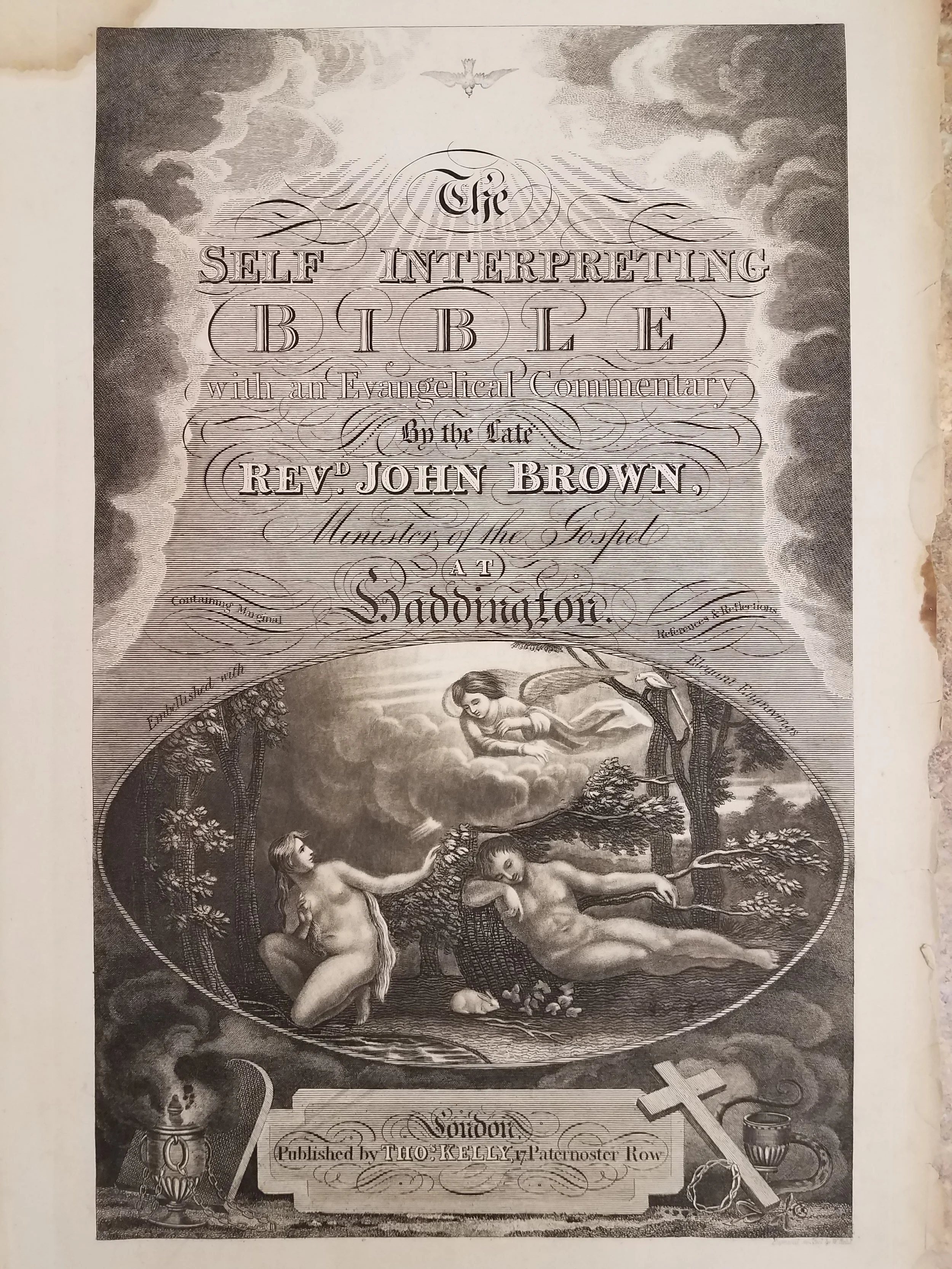 The title is The Self Interpreting Bible with an Evangelical Commentary “by the Late Rev’d John Brown, Minister of the Gospel at Haddington.” Printed in London in 1832, nearly 50 years after John Brown’s death in 1787, it contains 14 booklets called the Apocrypha plus end chapter “Reflections” to further enlighten 18th century Scottish readers.