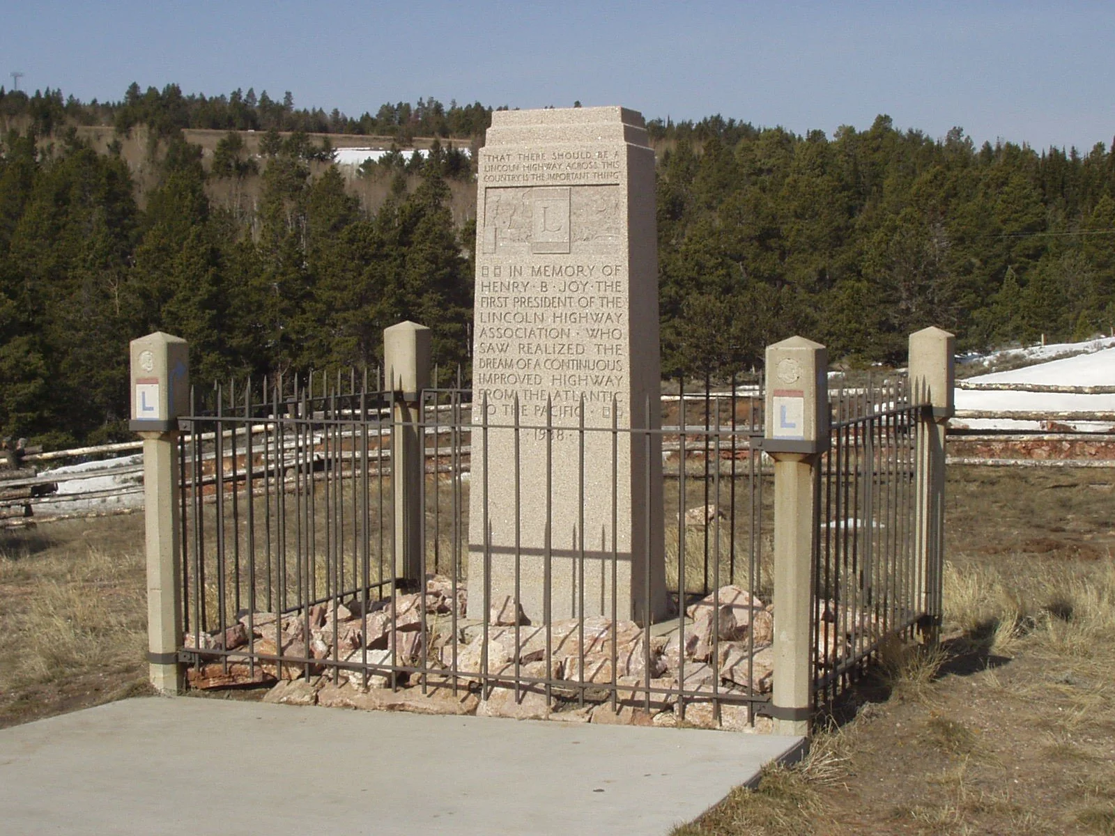 Caption: Adjacent to the Lincoln Monument nine miles east of Laramie, this monument at the Summit Rest Stop on Interstate 80 reads: “In memory of Henry B. Joy, the first president of the Lincoln Highway Association, who saw realized the dream of a continuous improved highway from the Atlantic to the Pacific.” Henry Joy did live to see the Lincoln Highway completed and nearly all paved from coast-to-coast. The monument was erected by Joy’s family in 1939 at a spot he loved along the Lincoln Highway (now near I-80 exit 184 in the Continental Divide Basin). It was where he had asked to be buried, with a 20 mile view in all directions. Joy was not buried there by his Detroit family when he died in 1936, but his wishes were honored with the monument at that site. Much later, the Wyoming Department of Transportation moved it to this site, and surrounded it with a fence and four concrete posts replicating the original Lincoln Highway markers. Photo courtesy of Judy Knight