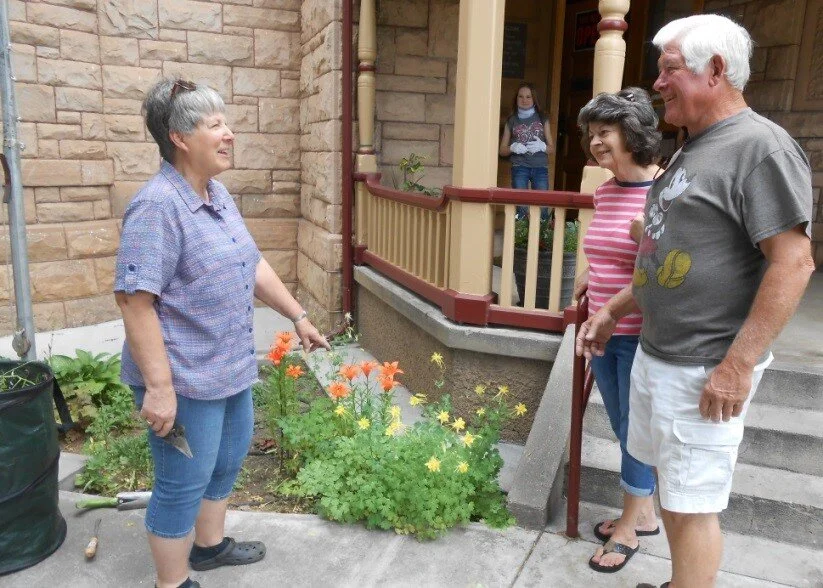 Caption: Carol Hoff, Laramie Garden Club member, visiting with Martha and Roger Farris of Mississippi. Shears in hand, Hoff is “deadheading” lily and columbine blossoms that are past their prime. Twice-weekly, volunteers maintain the gardens at the Laramie Plains Museum. In the background is Junior Docent Kyla Bressler, waiting to take the couple on a tour of the Ivinson Mansion. Photo by Judy Knight