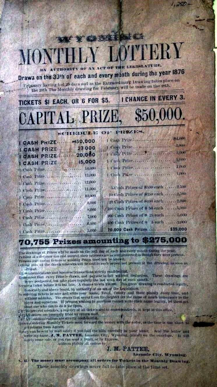 Caption: 1876 flyer announcing James M. Pattee’s Wyoming Lottery that gave a “temporary boost to Wyoming’s economy” according to T.A. Larson. The unscrupulous Pattee peppered other states with these flyers from his Laramie headquarters, thanks to a Wyoming Territorial Law of 1869-70 that allowed lotteries—but he pocketed most of the money. Photo courtesy of Emmett D. Chisum Special Collections, Coe Library, University of Wyoming.