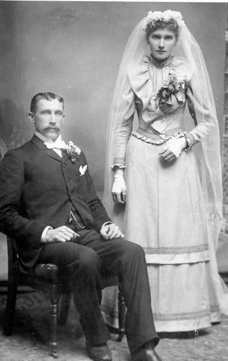 By the turn of the century, both the bustle and the hoop were out of style, so there was no good reason for the old-fashioned wedding portrait pose—except tradition.