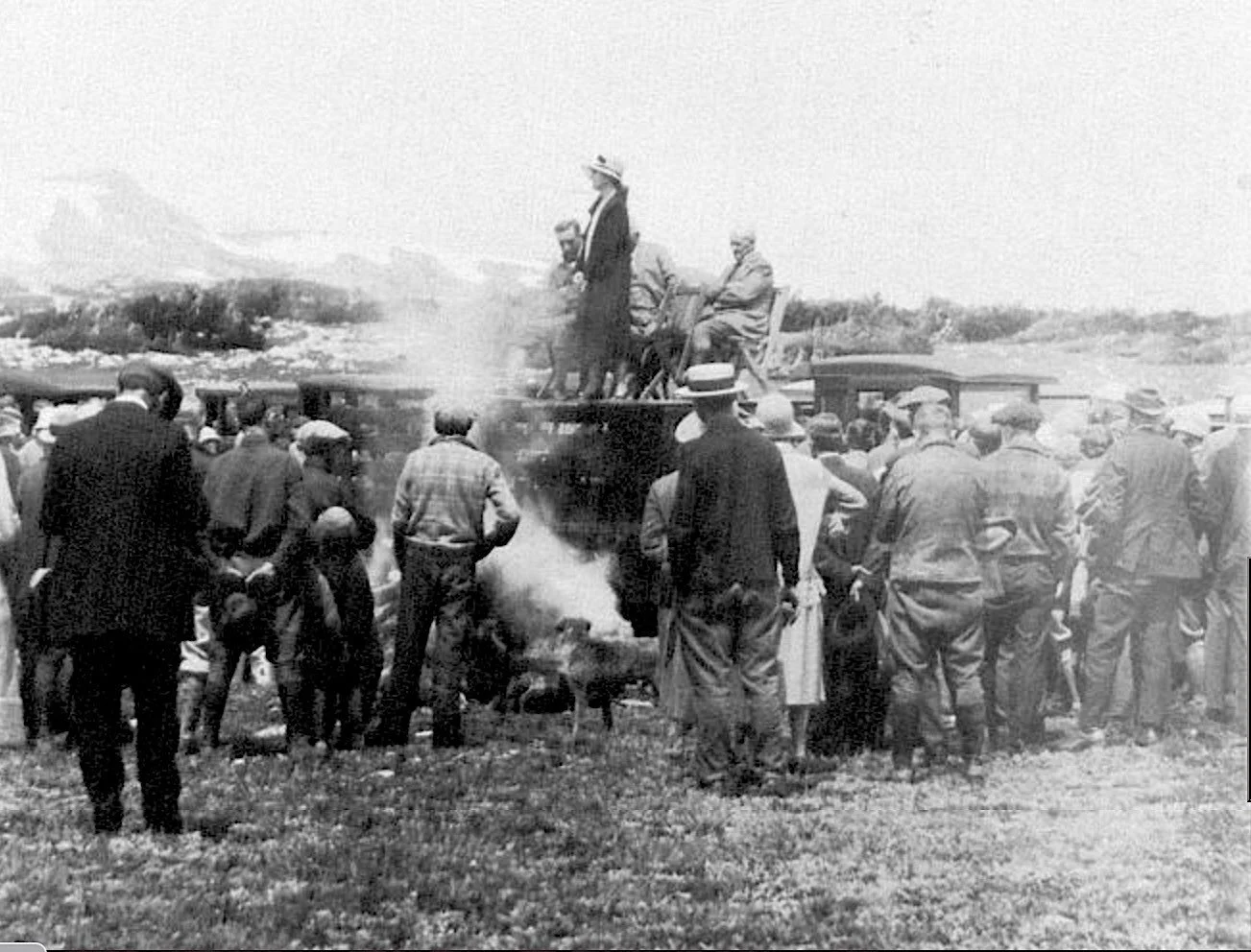 Caption: Caption: Warmed by a roaring fire, Governor Nellie Tayloe Ross (standing on makeshift platform) dedicates the "Great Skyroad" over the Snowy Range on July 4, 1926.