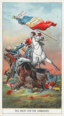 Color printing was an innovation that came along at just the right time. Trade cards with attention-getting images became popular—subtly or overtly carrying a message for medicines. A particularly outlandish trade card was distributed to druggists who carried Ayer’s Pills. It shows a rider on a white horse about to decapitate another opponent. Customers collected them to place in scrapbooks, use as bookmarks or as children’s playthings; so people held on to them.