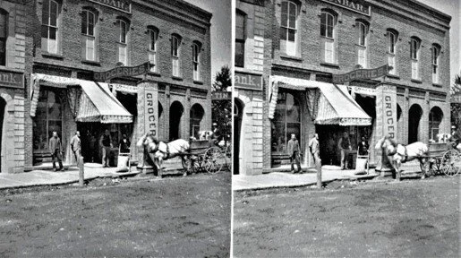 Caption: Jeffrey’s Bistro of Laramie currently occupies this building at 123 Ivinson Ave., shown here when it housed a drug store (and possibly a barber shop) before the building’s third story had been removed. Smoke in the distance is from the Laramie Rolling Mills, which employed about 300 men 24/7. Photo dates from 1910 when the mills burned down, or earlier. Stereographs like this can be seen at https://mountainscholar.org/handle/20.500.11919/3844