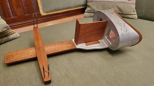 Above: Stereopticon viewer at the Laramie Plains Museum, showing the wooden slider holding the card on which the photographs are printed. Viewers move the cardholder forward or back to position it clearly for their eyesight to reveal the 3D image.
