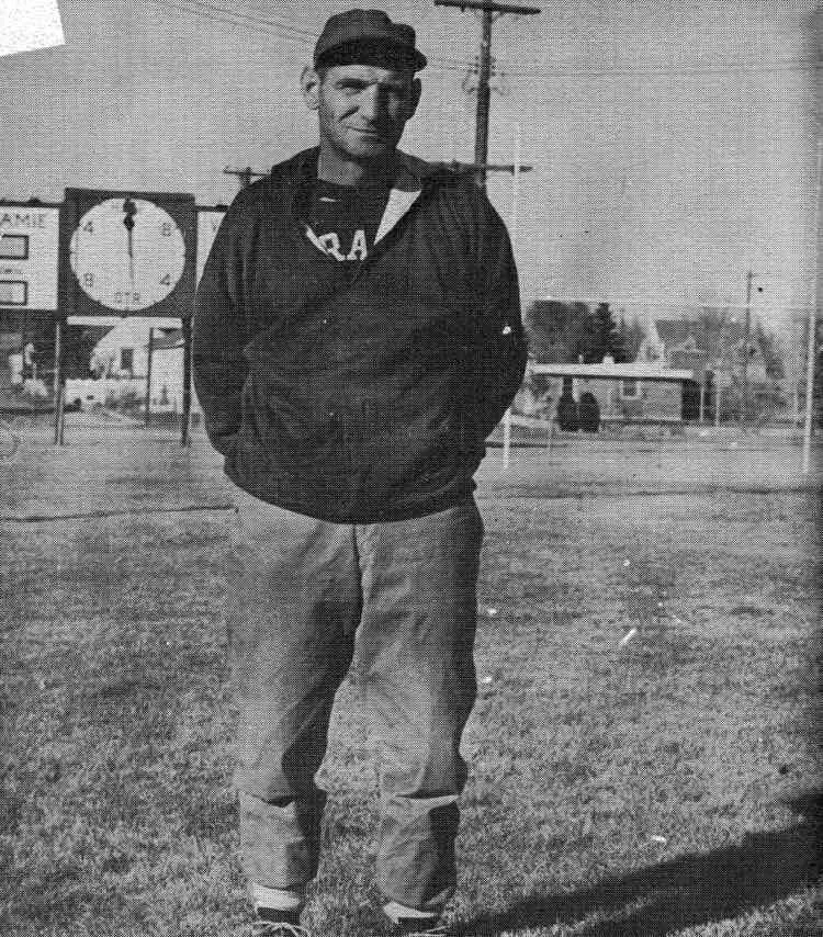 Coach John E. Deti standing in the center of Plainsman Field on Russell St. between 11th and 13th St.. The low-roofed ranch house in the background was built in 1954 and is still there on the corner of Steele and 12th Street. The house on the far right with dormers barely visible is on Park and 12th St.. Photo is from the 1956 LHS Plainsman yearbook, courtesy of Laramie Plains Museum. Webmanter’s note - the low roofed house was built by Peter Glen. My wife Barbara bought in the late nineties; it is where I live today. Kim Viner