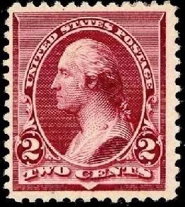 Caption: Most commonly used postage stamp in the 1890s, 2 cents for 1st-class domestic postage. George Washington has appeared on more U.S. stamps than any other person.