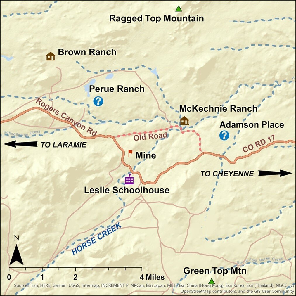 Caption: Horse Creek area landmarks along Rogers Canyon Road (CR17) circa 1922 based on recollections of residents and historic maps. Both the Strong Coppermine and the townsite of Leslie were short-lived after a 1907 fire ended the mining, but the school remained for a while. Perue and Adamson locations are not shown on historic maps though McKechnie and Brown ranches are shown. Old-timers consulted recall that Adamson and Perue were living north of CR17 in 1922, so both are shown with question marks. Documents report that both men received homestead grants between 1929-1936 that were closer to Green Top, about 4-6 miles south of the present CR17. It is impossible to tell for sure from available accounts precisely where these two ranches were located in 1922. Note that locals refer to CR17 (a gravel road) as “Rogers” Canyon Road, though most maps and road signs leave off the “s” in Oscar Rogers’ name.