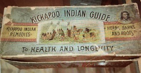 A colorful cardboard box in the Laramie Plains Museum (LPM) collection is labeled “Kickapoo Indian Guide to Health and Longevity.” It’s not clear what was originally in the box; it did have some cut-outs of “Indians,” their horses, tents and blankets that would have appealed to children. Possibly it once had some of the “herbs, barks and roots” advertised on the box as remedies. Turns out that the Kickapoo herbal concoction was made in New Haven, Connecticut; there was nothing “Indian” about it except the name. There is a real Kickapoo tribe that ultimately landed on an Oklahoma reservation, but it gave no medical secrets to the New Haven company.