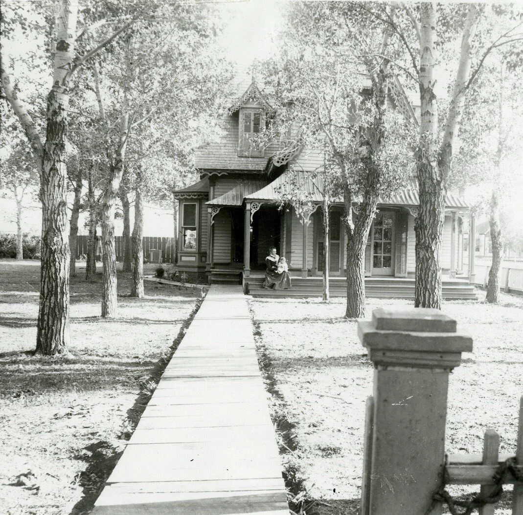 Caption: The Gothic Revival Holt House shown here when it faced Grand Avenue, with Emma Knight and her infant son Oliver on the steps. An alley separated this house from its neighbor to the west, which was Washington School, now an apartment building. It was turned on its foundation so that today its address is 310 S. 10th Street. Wilbur Knight, then his widow Emma and then their son Samuel owned the house for about 75 years. Sam and Emma have the unique distinction of each having a different building on the UW campus named after them, resulting in the slightly confusing existence of two “Knight” buildings on campus, one Knight Hall, the other Knight Geology. Photo courtesy of Laramie Plains Museum