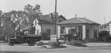Gas pumps in 1925 were hand pumps operated by an attendant. The gas would be pumped into a calibrated reservoir at the top of the pump, and gravity caused the gas to flow through the hose into the vehicle tank. There was no automatic shut-off, so “filling a tank” could easily lead to spilled gasoline. One of the two pumps at the Aero station was regular gasoline which cost about 20 cents per gallon in 1925, while the other was probably higher octane and more expensive “ethyl”. Although there was no self-service in 1925, windshields were washed and the engine oil was checked with every fill-up. You might even get the air in your tires checked.