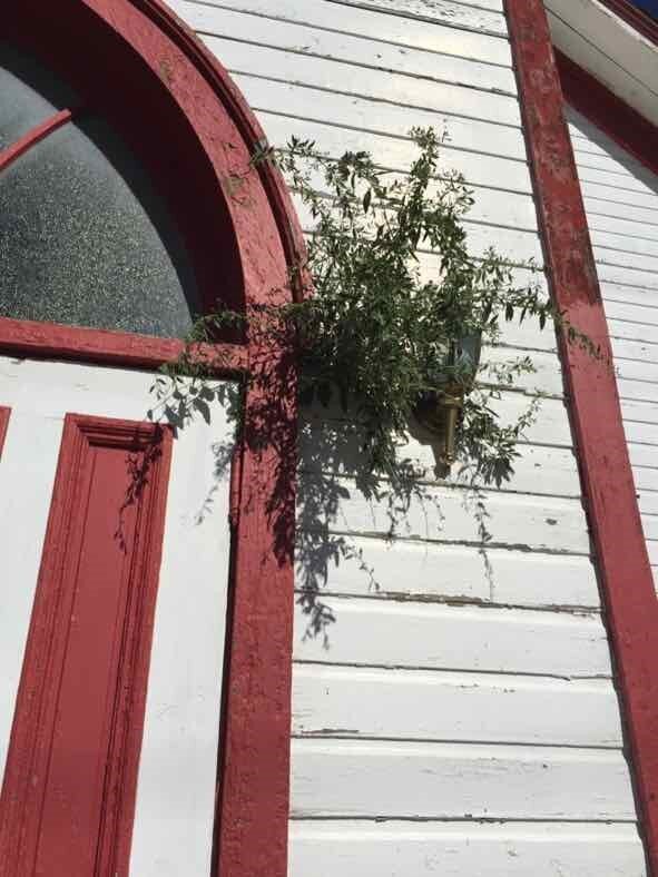 Matrimony vine also thrives on the grounds of the now-vacant 1885 Scandinavian Lutheran Church at 201 South Pine St., where it receives no additional water and yet was obviously climbing up the interior of the building from plants that were growing under the front door this summer. Someone cut it back in late August, but it has resprouted and is again growing through the siding.