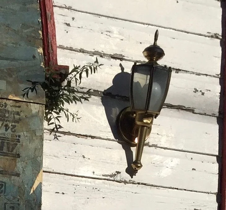 Caption: Four weeks after cutting back in late August, the vine is again sprouting in the same place as before. Other dramatic changes are that the light fixture once completely hidden is now visible and the church door and all the windows have been covered in plywood