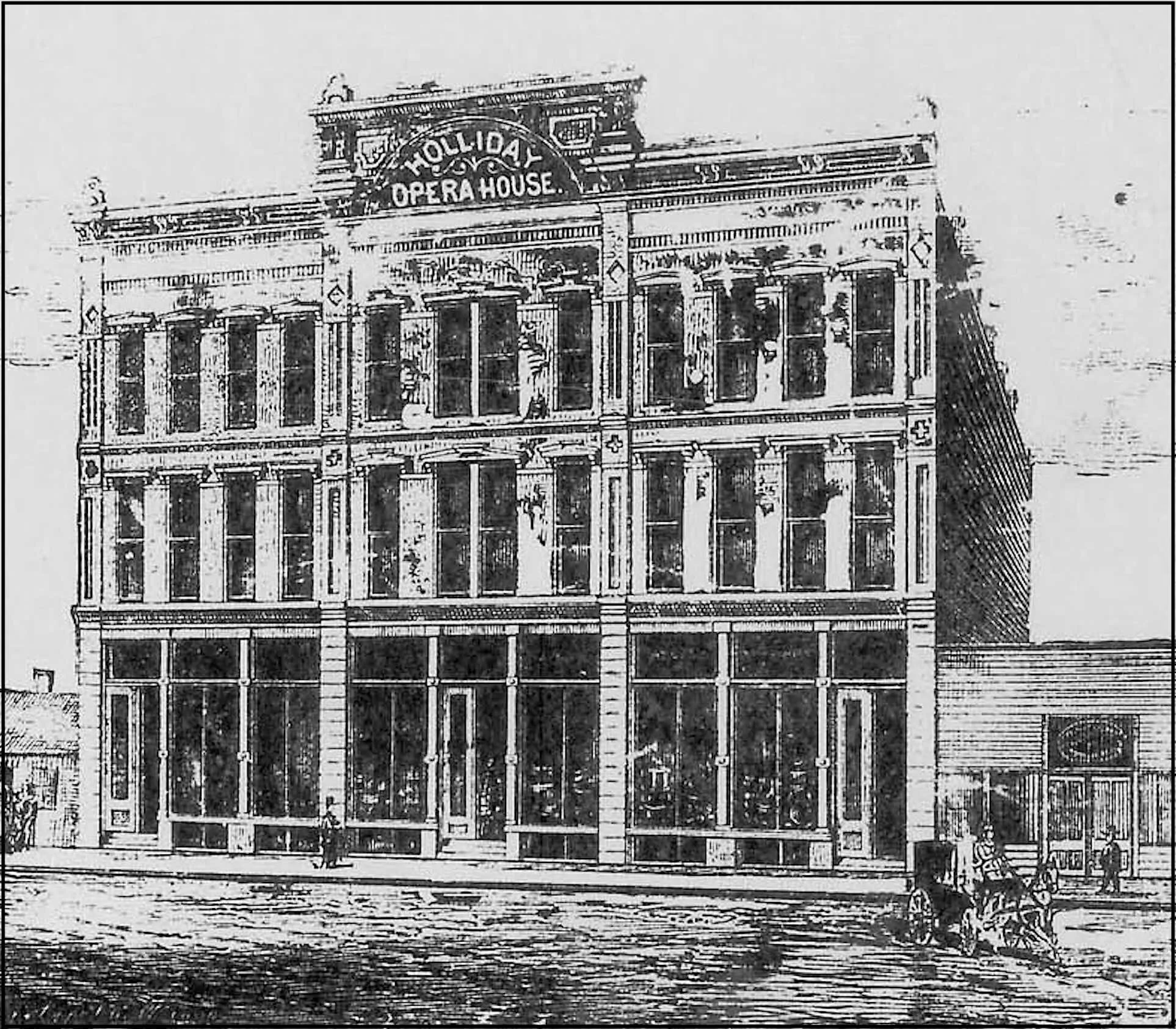 Caption: Holliday Opera House c. 1885. The building burned to the ground in 1948, in the great Holliday Fire, which destroyed much of downtown Laramie.