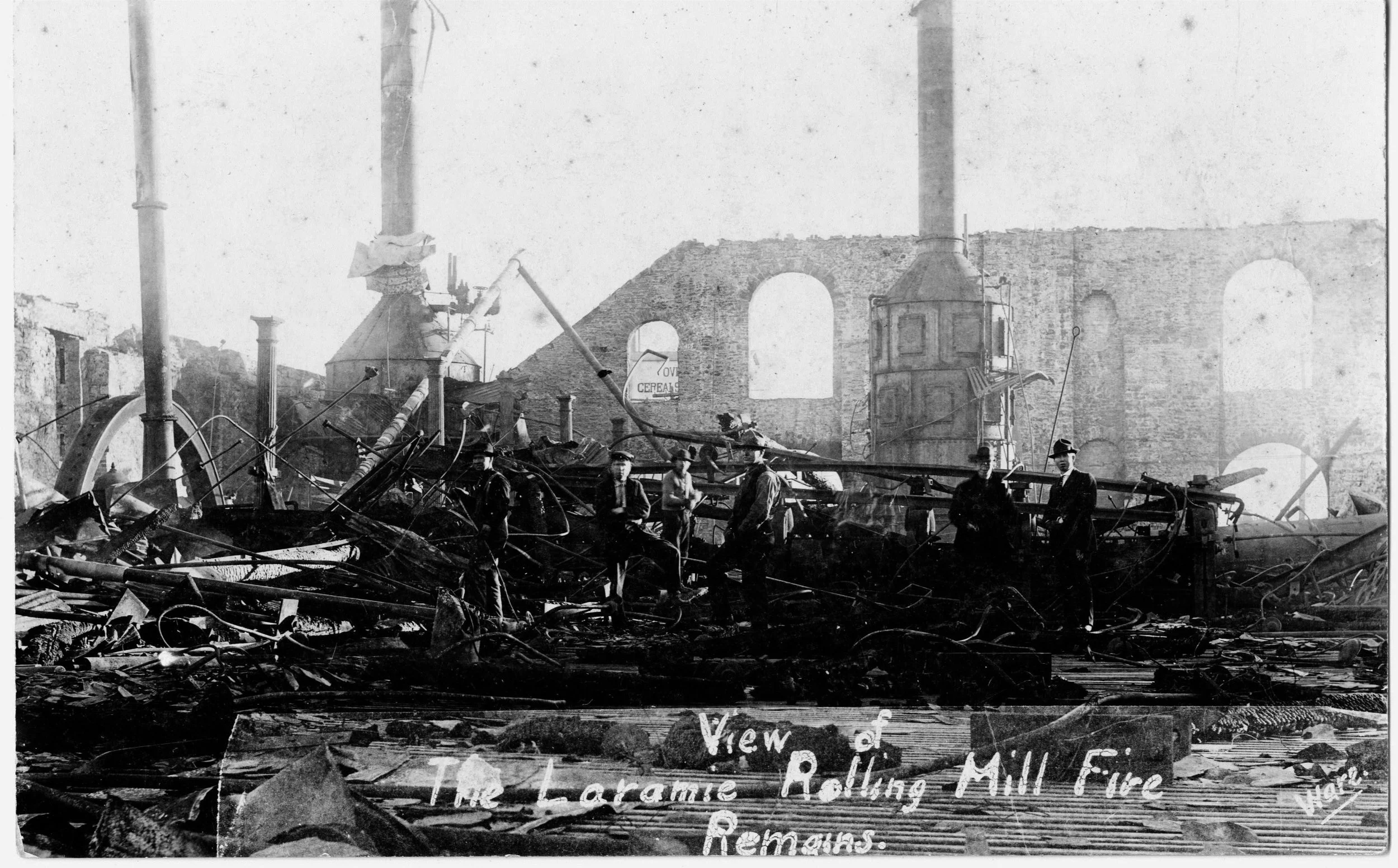 Caption: Remains of the Laramie Rolling Mill after the November 8, 1910 fire that destroyed it. Men are inspecting the wreckage, with a section of the three-foot thick wall built of stone rubble that was about all that remained after the roof burned through. The name “Ware” written on the negative along with the caption indicates the photo was probably taken by Walter E. Ware, who was brought to Laramie by the UPRR as a draftsman/architect for the railroad shops, and may have designed the mill as well. He designed several private homes in Laramie, such as the Ivinson Mansion, before moving on to a prosperous architectural career in Salt Lake City. Photo courtesy of the Laramie Plains Museum.