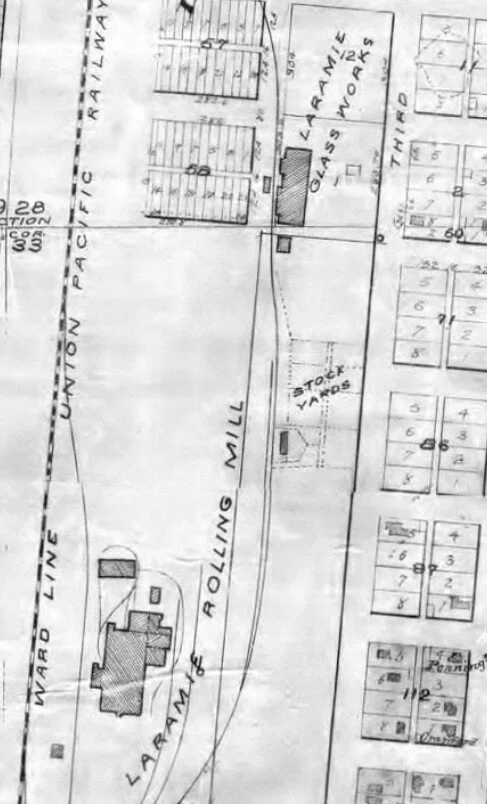 Caption: Laramie City map from the time the glass factory was in operation, showing its location on 3rd St. and north of the first location of the Laramie stockyards about where the Snowy Range Bridge is now. Courtesy of Kim Viner.