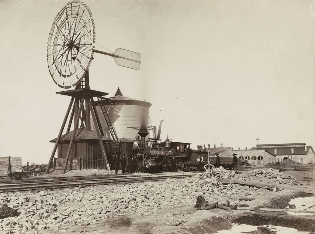 Caption: UPRR windmill and water storage tank at Laramie City, 1868. It represents another money-making scheme by Thomas Durant who owned stock in the company that prefabricated these windmills. Durant ordered them for the watering stops along the railroad, thereby enriching his pockets. Photo taken looking north from about where East Park Street meets the tracks today. Laramie railroad shops are in the right side distance. Photo by A.J. Russell, official Union Pacific Railroad photographer, courtesy of the Library of Congress.