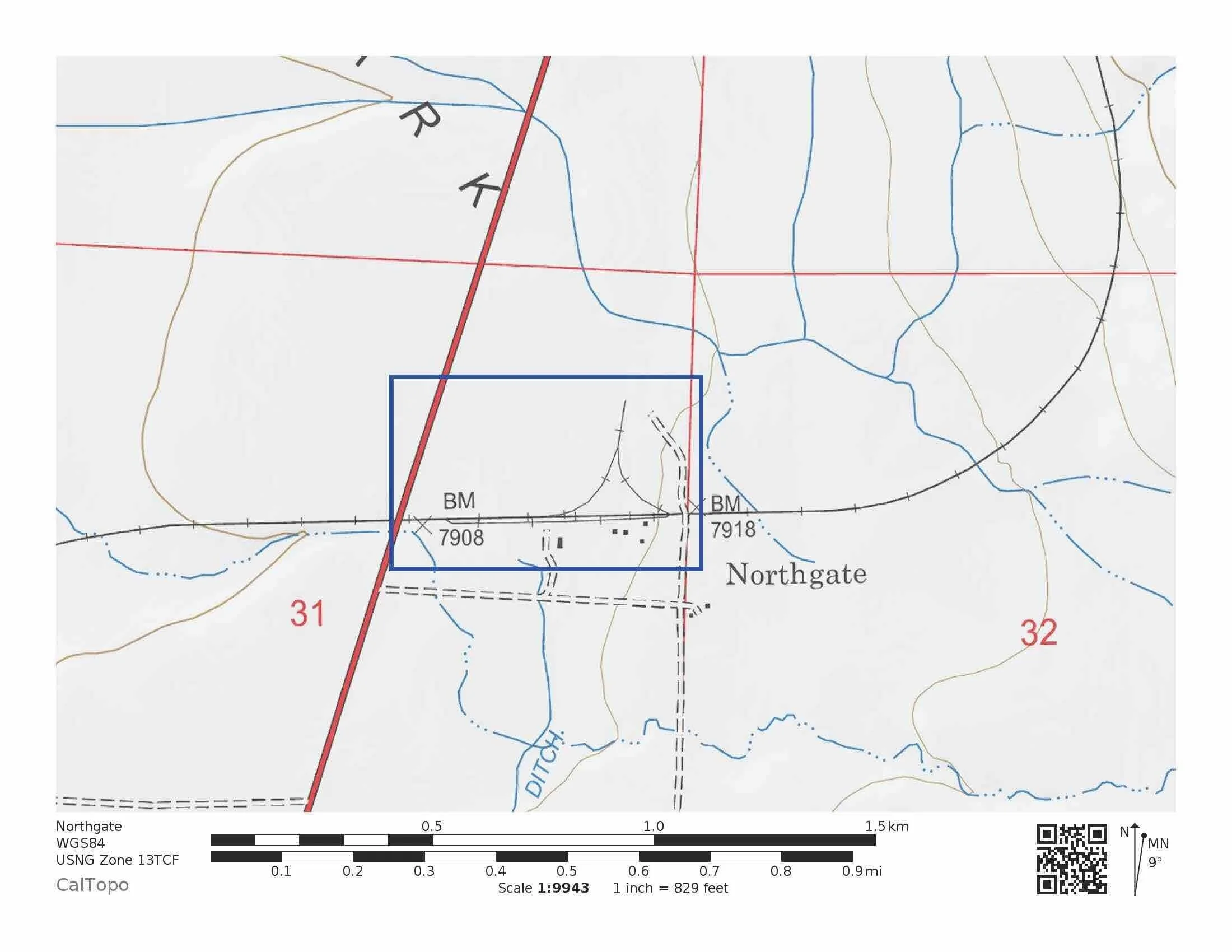Stop 3. 2.1 miles south of the junction with Colorado 127 on Colorado 125 is the Northgate loading station, where fluorspar was transferred from the trenches on the east side of the road (now empty) onto traincars. Satellite images and old topographic maps show the railroad “wye” immediately east of the trenches that allowed trains to reverse direction. From Northgate, the railway continued on the west side of highway 125 south to Cowdrey and Walden, and then on to its terminus at Coalmont.