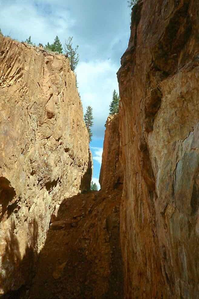 Mining operations consisted of both underground workings and large, linear open cuts. The deep, narrow open cut at the Fluorspar mine pictured indicates the flat sheets of the fluorspar vein-filled faults. The faults are related to the Rio Grande rift, a long, narrow region where the crust has been stretched and faulted. This rift zone runs north-south through New Mexico and Colorado, narrowing and terminating near the Wyoming border.