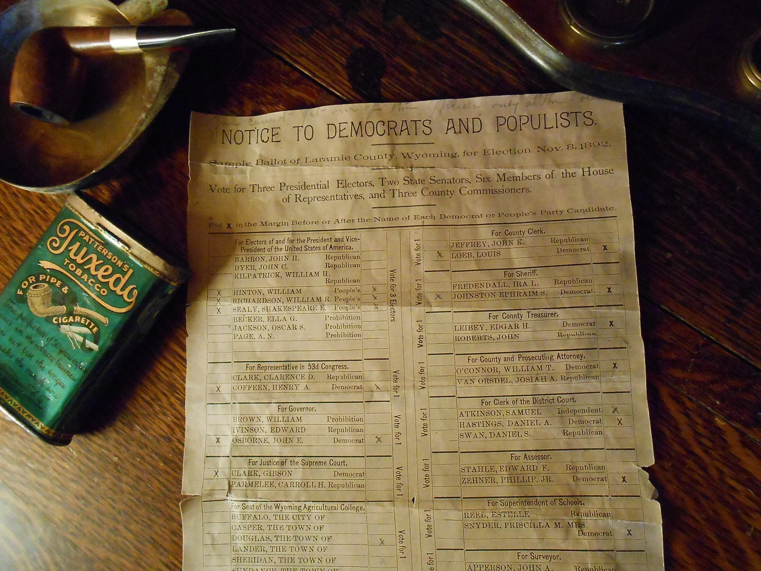 Photo Caption: Sample ballot from the November, 8, 1892 Wyoming election, with Populist and Democrat candidates pre-marked with an "X". Such ballots were distributed by political parties prior to the election to "help" voters decide how to cast their votes. Edward Ivinson, the Republican candidate for Governor (third box down from the top), also had an opponent from the Prohibition party. The Democrat, John Osborne of Rawlins was the ultimate winner. This ballot is for Laramie County, but there would have been a similar one for Albany County, a Wyoming Territory starting in 1868. The fifth box down shows that there was also a vote for "seat of the Wyoming Agricultural College" (with the federal money that came with its establishment), which is pre-marked by these partisans for Douglas. The Albany County lobbying effort kept the Agricultural College in Laramie at the University of Wyoming, which had been established in 1887. Shown on the desk in Mr. Ivinson's Smoking Room in the Ivinson Mansion, now the Laramie Plains Museum. Yis image and the thumbnail courtesy Laramie Plains Museum
