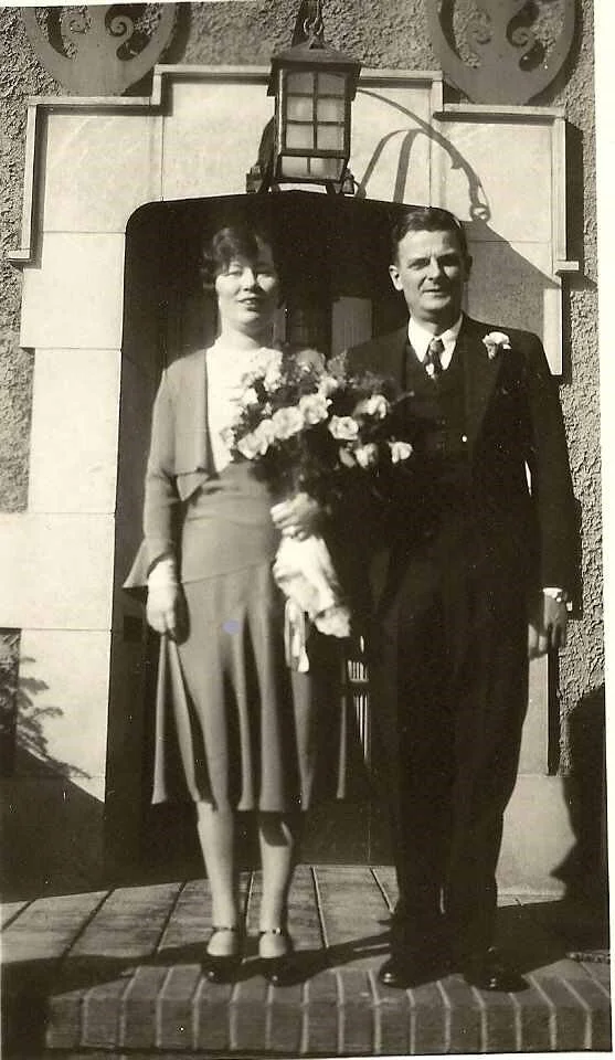 (Caption:) Verna Johannesen and Wilbur Hitchcock on their wedding day in 1930, posed on the front steps of the house he designed at 262 North 9th, Laramie. The house is still in the Hitchcock family, one of the many that Wilbur, an architect, designed in Laramie. Wilbur died just 11 days later when they were on their honeymoon in California. Verna stayed in Laramie, raised her four stepchildren and had a remarkable career at UW. Photo courtesy of Ann Boelter, Wilbur Hitchcock’s granddaughter