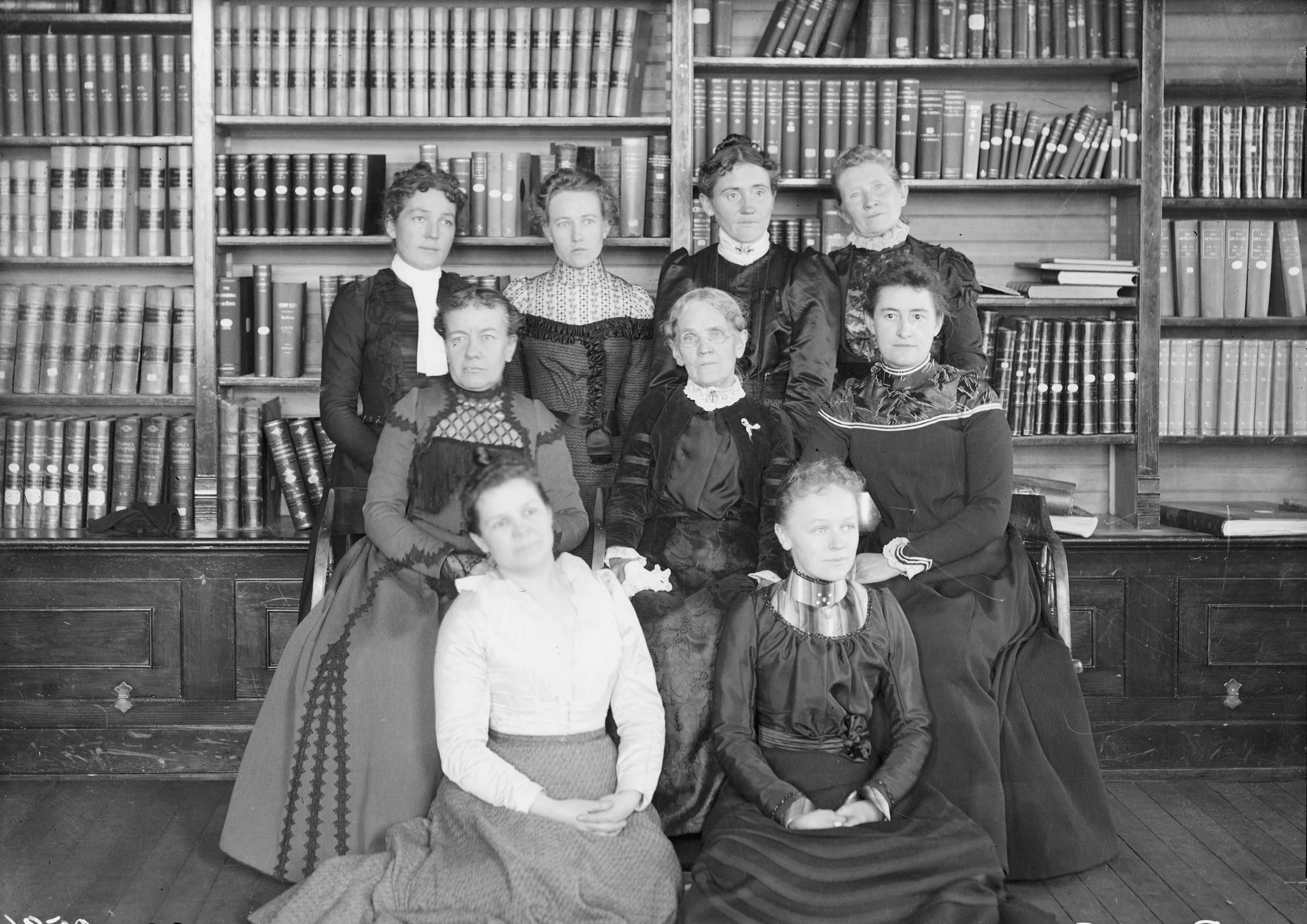 Caption: “Business and Editorial Staff Woman’s Edition of the Boomerang,” A pose similar to one published on page 8 of the 16-page special edition. S.H. Knight identified his mother and the other women as follows (left to right): Back row: Mrs. Wilson, Jeanette Naismith Harris, Mrs. Emma Howell Knight, and Mrs. W.J. Garlock. Middle row: Mrs. Lida Eaton Fitch, Mrs. Mary G. Preston, and Mrs. Mary Godat Bellamy. Front row: Mrs. Eleanor Quackenbush Corthell and Mrs. Maud Southworth Buffum. His identification of the first woman, “Mrs. Wilson” is possibly wrong—it may be May Preston Slosson, whose mother, the widow Mary Garlock Preston was the edition’s general editor—she lived with the Slosson family.