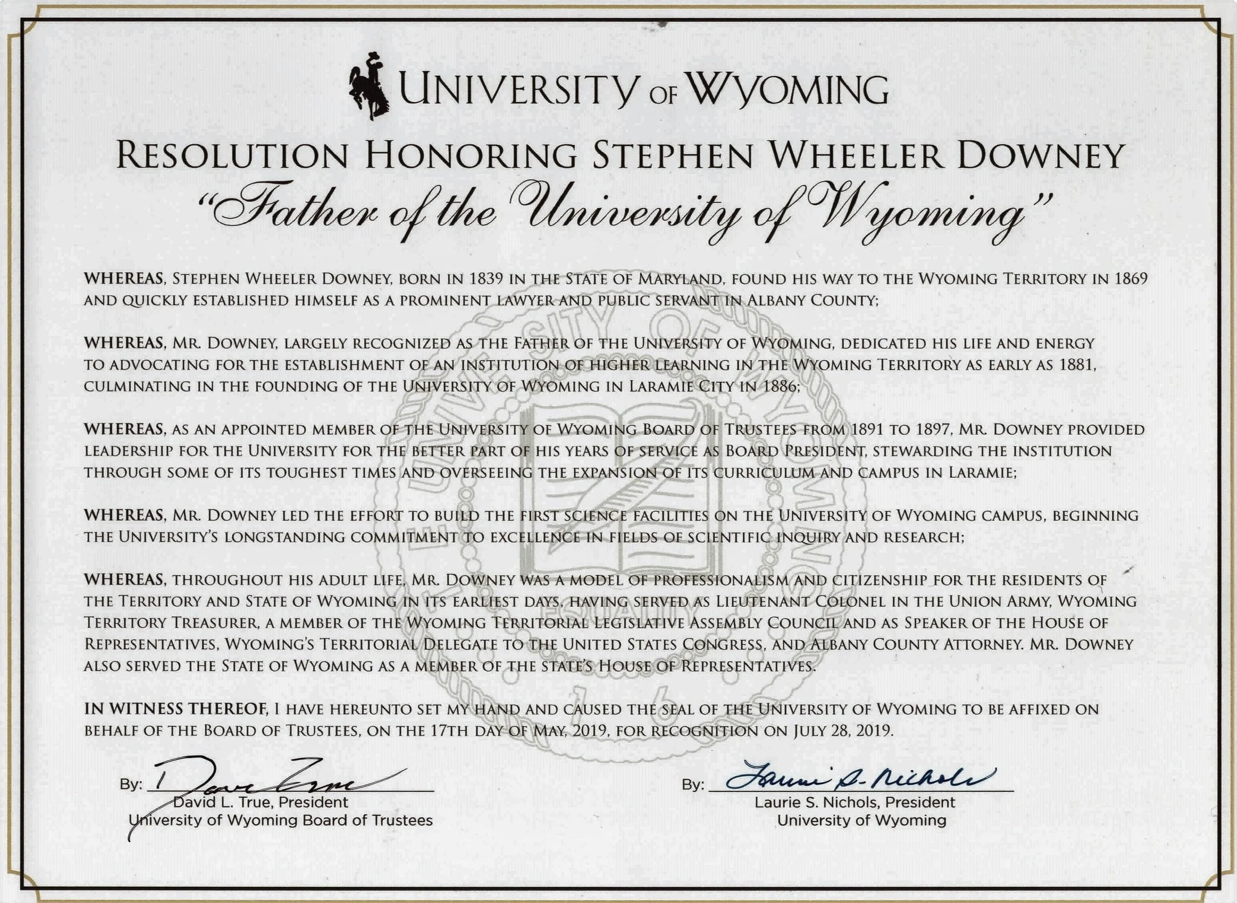 University of Wyoming resolution naming Stephen Wheeler Downey Father of the University. Note: the resolution says Downey was a lieutenant colonel when in fact his final rank was colonel. The error is the author’s.