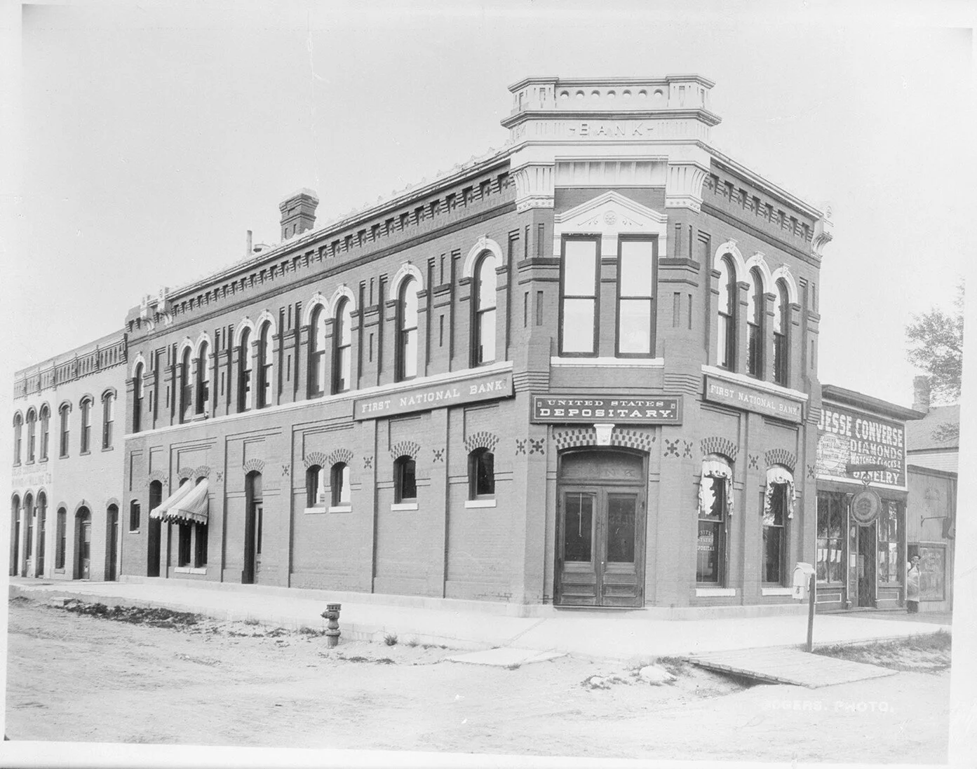 Caption: The NE corner of Ivinson and 2nd St., Laramie around 1891. Jesse Converse sold the corner location to the First National Bank of Laramie, and relocated next door, keeping the “sign of the large watch” that his stepfather had when it hung outside his shop, originally on the corner. Next door can be seen the shoe shop of H.G. Welch, in what was an original Laramie log cabin. Along 2nd St. and behind the bank is a building which might be the one at 115 S. 2nd where Jesse and Catherine Converse lived throughout all of their married years together—on the second story.
