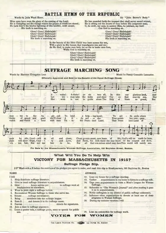 Caption: Marching Song and a Suffrage Pledge Slip to help win the vote for women in Massachusetts; a flier given to all 15,000 marchers in the Boston Parade, May 3, 1914.