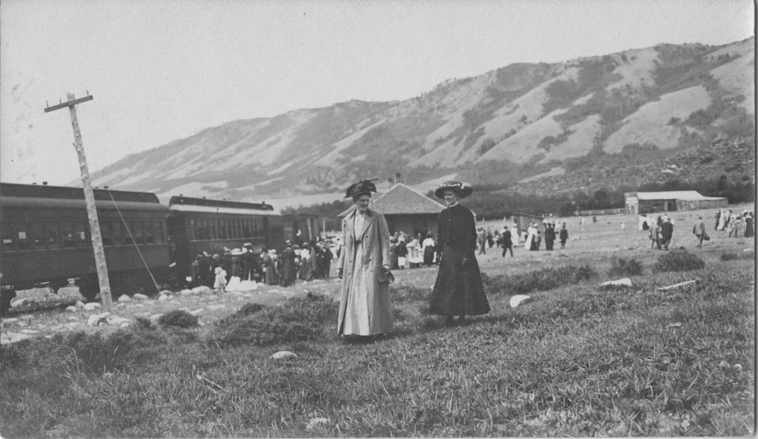 Caption: Neva Nelson Ford of Laramie (in black) and her mother, Mrs. Aven Nelson have alighted from the excursion train to Centennial on the LHP&PRR, c. 1907. Behind them, the depot at Centennial is shown in its former location on the west side of the railroad tracks. It has now been relocated further east on the edge of town and is the centerpiece of the Nici Self Historical Museum. Nici and Pat Self operated the “Old Corral” of Centennial, a popular watering hole for locals and tourists in the 1950s through 1980s. It burned twice; the current Old Corral in Centennial is the third establishment with that name on the site. Photo courtesy of the Laramie Plains Museum